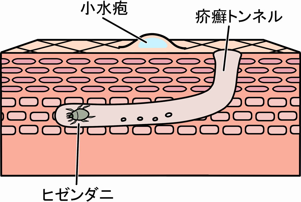 疥癬(かいせん)は、ヒゼンダニという小さなダニが皮膚の表層に寄生しておこる皮膚の病気です。ヒゼンダニは0.2ミリメートルから0.4ミリメートルの白っぽい体をしていますが、肉眼で虫体を見分けるのは困難です。